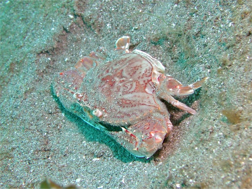 けっこう大型で、甲羅の幅が10cm以上あったと思います。しかし、遮蔽物の何もない砂地ではこの大きさでも臆病にならざるを得ず、砂の中にもぐっているのがフツウで、今回はわざわざJapanから来てくれたゲストに報いるための特別出演でした。