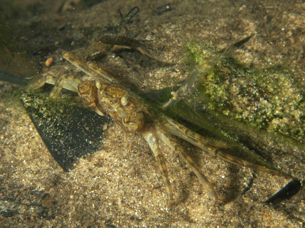 撮影 2008/05/11 沖縄県 石垣島 掲載 2012/12/25 ⇒カニの仲間 渓流域の砂だまりで撮影しました。 甲に比べて足がずいぶん長いし、脚の等間隔の黒色横帯があるのでサワガニの仲間ではないと思うのですが、淡水のカニについては全く知識がないし図鑑らしい図鑑もないので名前はわかりませんでした。