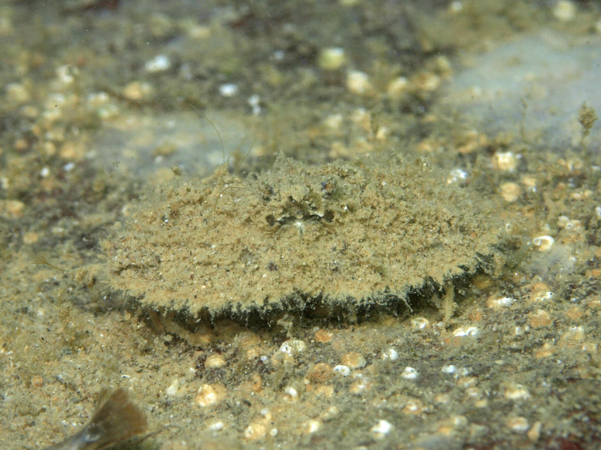 その佇まいからしてヒシガニ科の仲間であることは間違いなさそうです。しかし、カモフラージュのためか、イヤでもくっついてしまっているのか、眼以外の全身に泥が積もっていてそれ以外のことは何も分かりません。折りたたんでいるハサミ足と体の境界もほとんど分かりません。