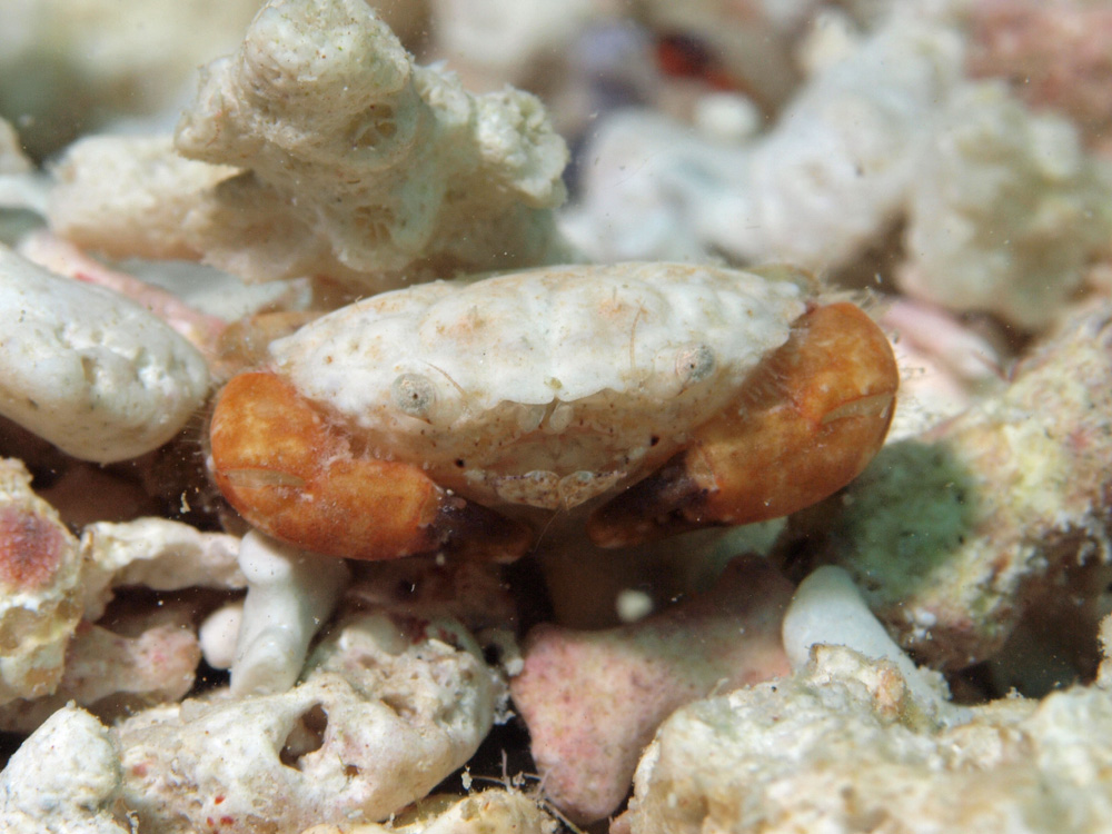 正面顔が可愛い(と思うのは管理人だけかな?)ので、今回は甲面と合わせての2枚の写真を掲載します。オレンジ色のハサミ脚以外は白色系です。ミルク色の甲面は死サンゴの瓦礫の中ではそれなりのカモフラージュになっています。