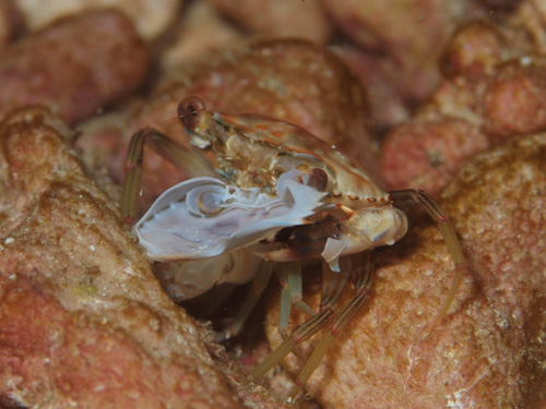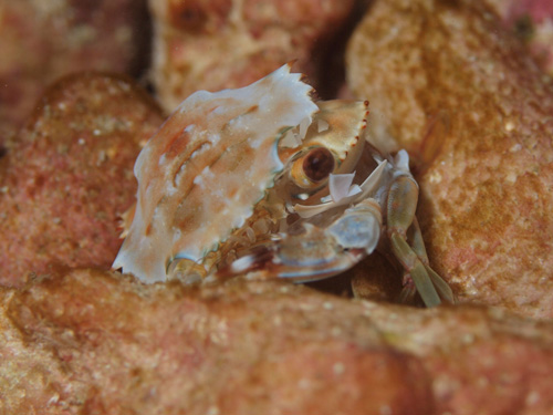 撮影 2014/10/03 沖縄県 石垣島 掲載 ⇒カニの仲間 甲や脚の形からしてワタリガニの仲間に違いないでしょう。 ちょうど脱皮シーンだったのでその様子を連続撮影しました。カメラマンに気づいていたでしょうが、素早く脱皮することが第一優先事項なので、無視されました。計6枚で、左から右、上から下です。