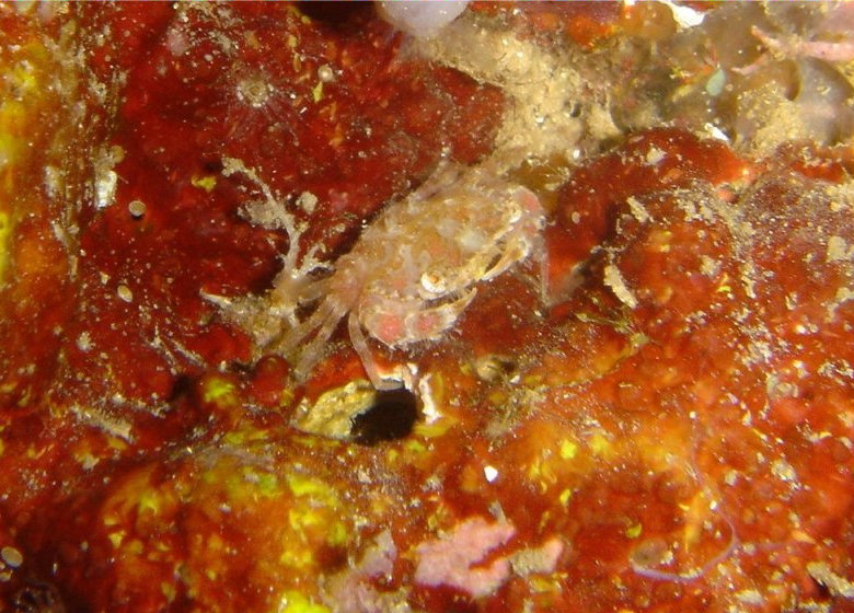 ナイトダイビングで出会った甲幅1.5cmくらいの小さくて綺麗なカニですが、第4歩脚の先端が平たいことからワタリガニ科であることぐらいしか分かりません。ベニツケガニ属かなー。