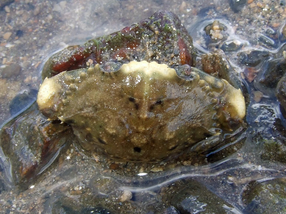 撮影 2008/08/01 沖縄県 石垣島 掲載 2013/02/04 ⇒カニの仲間 陸上撮影です。海岸を散歩していて石をひっくり返したら出てきました。 前側縁が9歯あり、歯の大きさはほぼ同じです。 ワタリガニ科であることは確実として、ガザミ属かなーと思ったりしましたが結局はっきりしないままに終わりました。