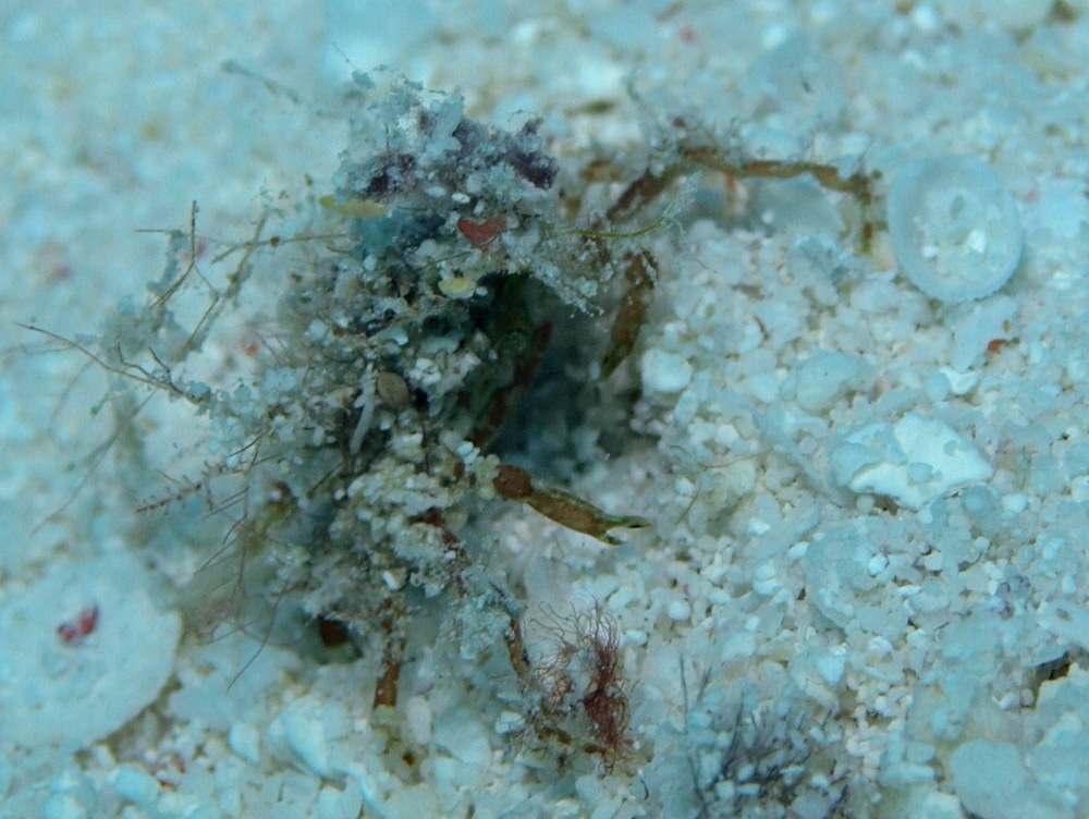 撮影 2008/10/16 沖縄県 石垣島 掲載 2013/05/08 ⇒カニの仲間 これは初めからギブアップ。 はさみ脚や歩脚が見えていることからカニだとは分かりますが、こんなにいろいろなものを体にくっつけたら何が何やらさっぱり分かりません。 原寸大では右眼が分かるのですが、縮小したこの写真ではそれすらもほとんど分かりませんネー。
