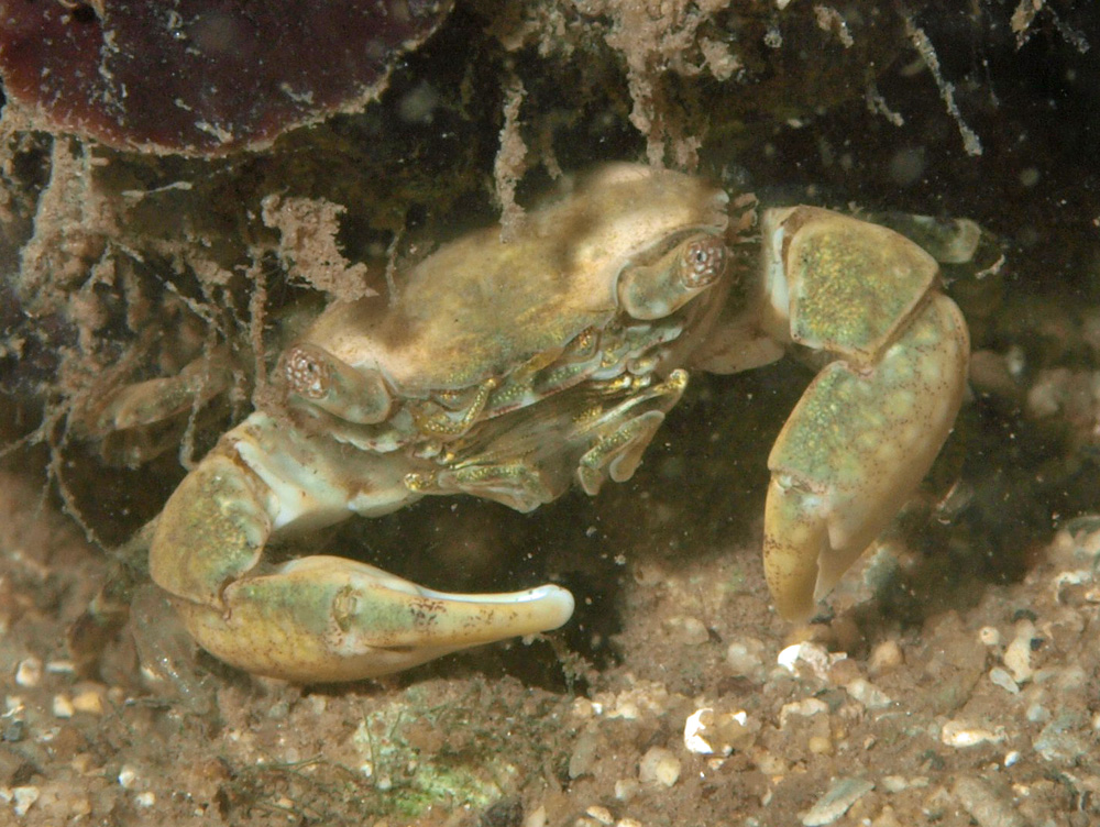 撮影 2009/02/05 沖縄県 石垣島 掲載 2013/07/30 ⇒カニの仲間 薄緑の体色ではさみ脚には茶色で点線の網目模様が見えます。はさみは馬蹄形。眼柄は長めで目には茶色で実線の細かい網目模様が入っています。甲はかなり平滑。 といった多くの特徴が見てとれますが、該当する種類は分からずに終わりました。ハハ、残念。