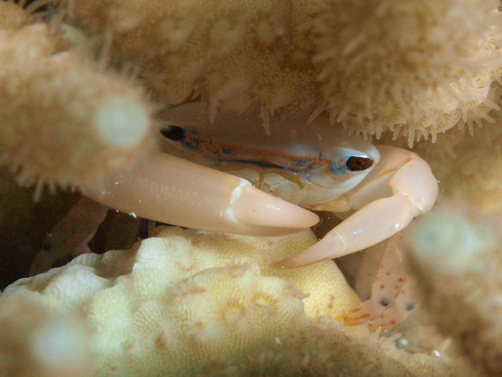 撮影 2009/05/18 沖縄県 竹富島 掲載 2013/11/19 ⇒カニの仲間 『海の甲殻類』 峯水亮/武田正倫/奥野淳児 (2002年初版2刷 文一総合出版)287ページ下段右にヒメサンゴガニ属の一種として掲載されています。