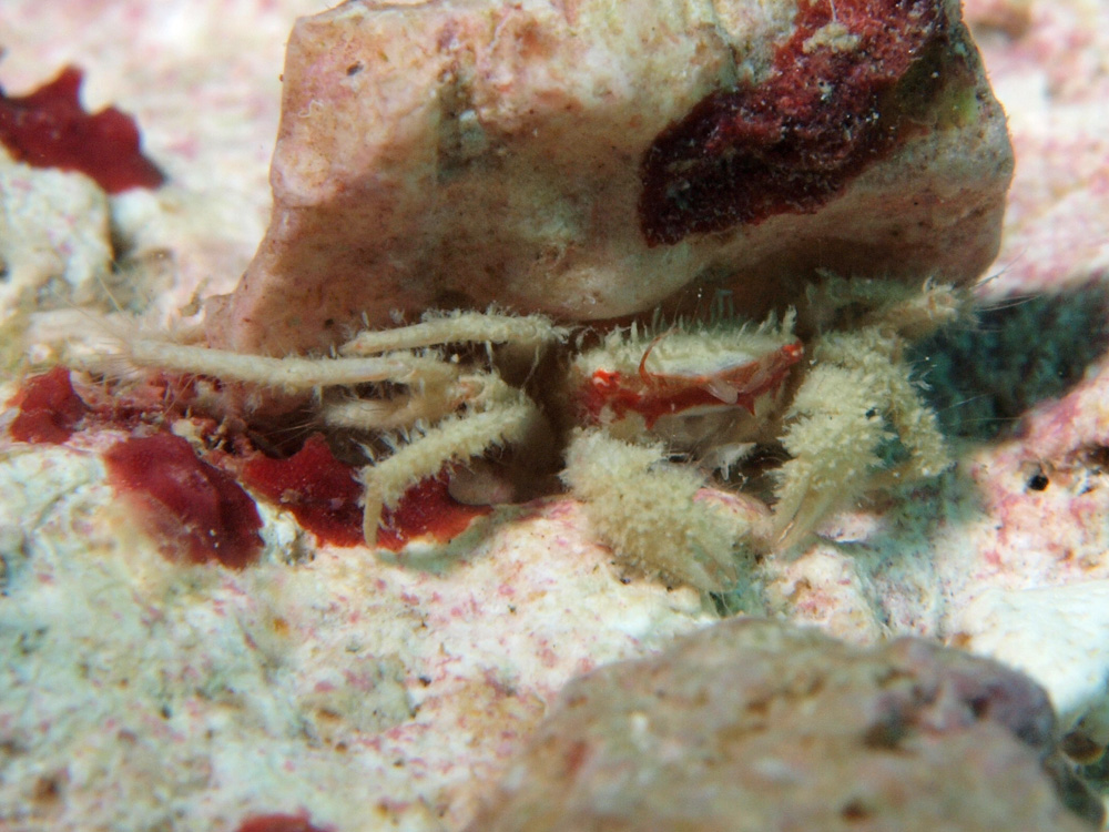 撮影 2012/05/07 沖縄県 沖縄島 掲載 2015/09/04 ⇒カニの仲間 イワガニ型の甲の形でやけに長い脚の持ち主です。顔面のオレンジっぽい赤が印象に残りますが同定の役には立ちませんでした。(俗称:赤仮面) 正面からと背面からでは印象がかなり異なるので、同一個体の両面の写真を掲載しました。