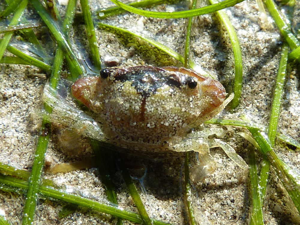 ちょっと見ではフタバベニツケガニモドキに目の色や甲の形が似ていますが、そっちは歩脚に不鮮明な帯があるのに対してこちらは小さな黒斑のようなものが散らばっていて同種ではありません。