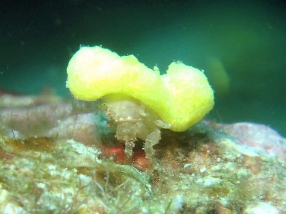 撮影 2010/03/29 沖縄県 石垣島 掲載 2014/12/16 ⇒カニの仲間 おっと、横向きでした。でもそのおかげで後ろ足でかむりものを支えている様子がよくわかります。 1本で支えているのかと思っていたら2本でした。はがすのは難しそうです。もちろん、はがそうとしたりはしません。