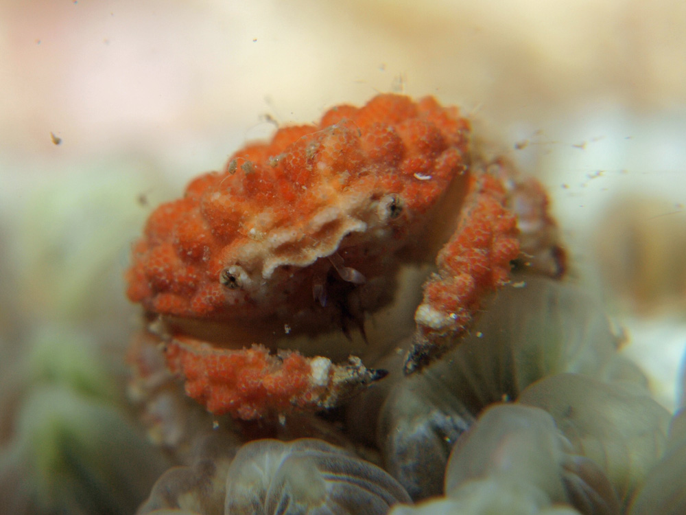 撮影 2012/06/07 沖縄県 沖縄島 掲載 2015/10/18 ⇒カニの仲間 全身ぶつぶつのコブに覆われて、これはこれでカワイイなあ。 眼に十字(?)の切れ込みがあります。何のためなんでしょうか?チョット見は付け睫毛みたいですが、まさか、オシャレのためじゃあないですよね。