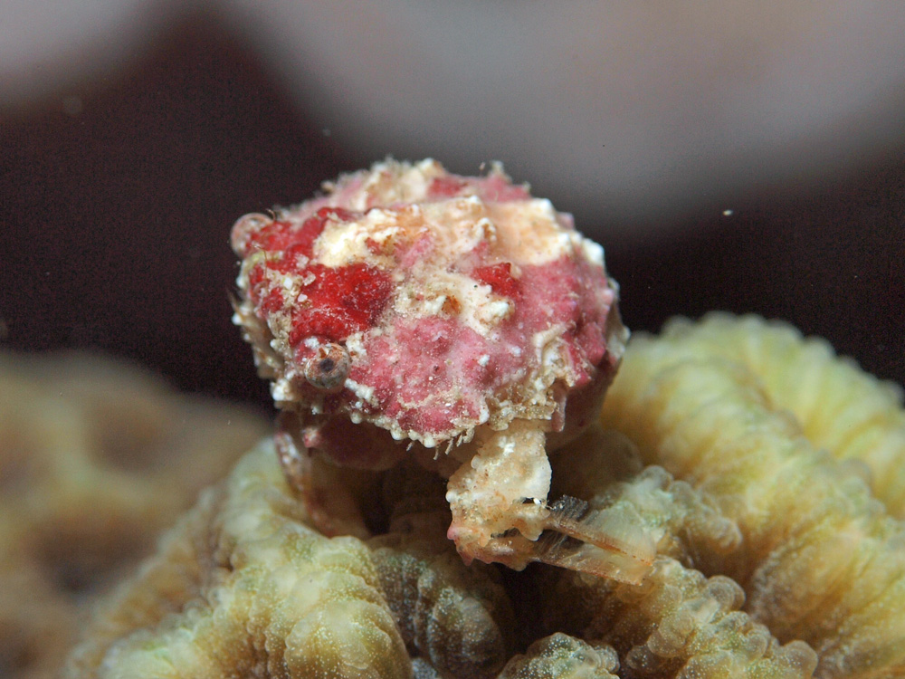 撮影 2012/06/07 沖縄県 沖縄島 掲載 2015/10/24 ⇒カニの仲間 ナイトダイビングで撮りました。ちっちゃくて、丸っこくて、甲がトゲトゲしていて、可愛らしいのですが種類は完全不明です。カニさんは不明が多くて、ハア〜〜〜(深いため息)。