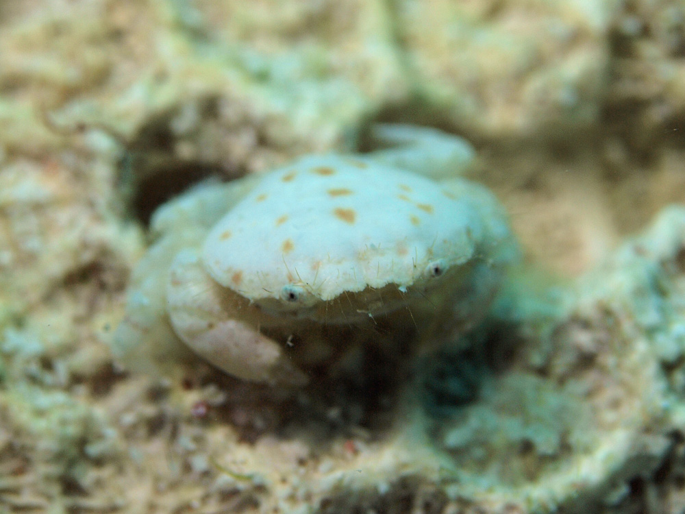 甲の形やすべすべ具合からするとゴイシガニの近縁だと思います。ゴイシガニそのものかもしれません。素人判断ですが。…と、あえて断りを入れる意味は実はありません。ほかの掲載画像の40%ほども素人判断ですから。