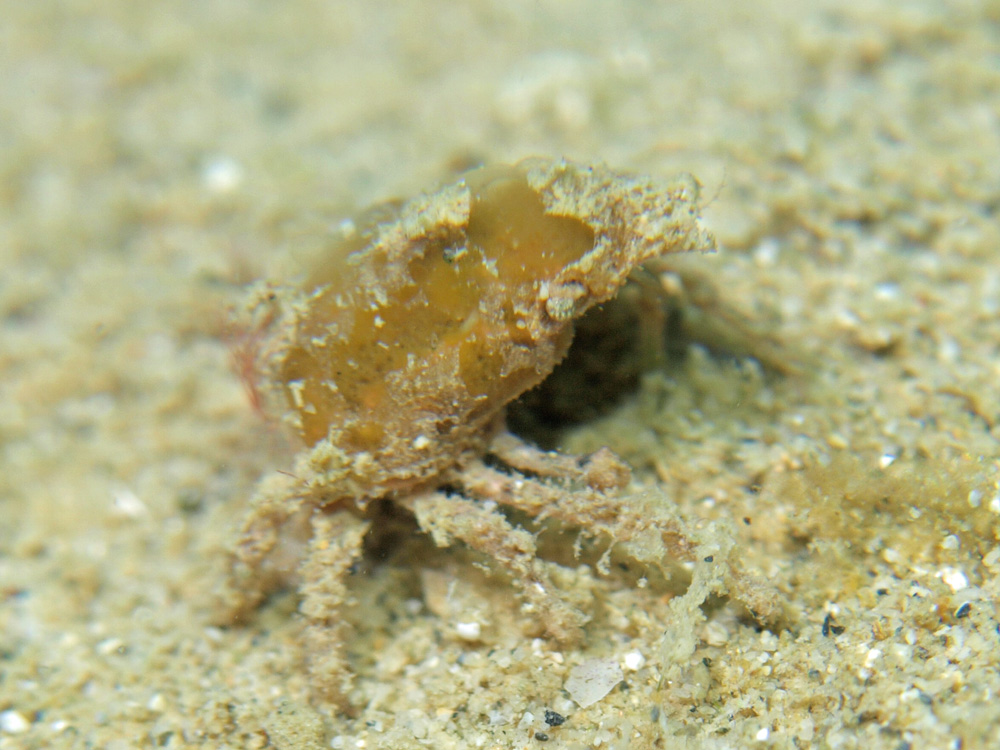 ガイドが「クモガニSP」と言っていました。後で図鑑をあたってみたらイッカククモガニが似ているように見えましたが、同定の決め手の一つである「甲の各域のコブ」がないのでハズレです。イッカクガニも似ていて甲の各域にコブはないけれど額が長くて先端が二つに分かれるので、それもハズレです。