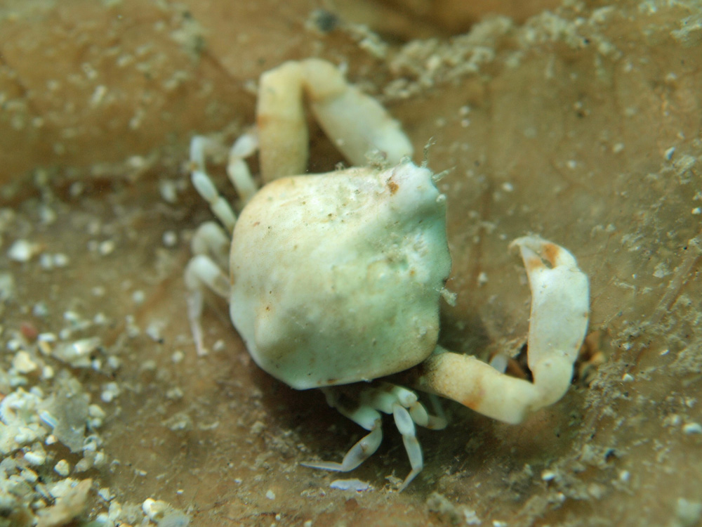 撮影 2013/07/31 沖縄県 沖縄島 掲載 2016/10/22 ⇒カニの仲間 甲幅1cm程の小さなカニでしたが、おそらく大人です。名前知らず。今回は甲殻類に詳しいガイドも分からなかったので、未記載種の度合いが高そうです。