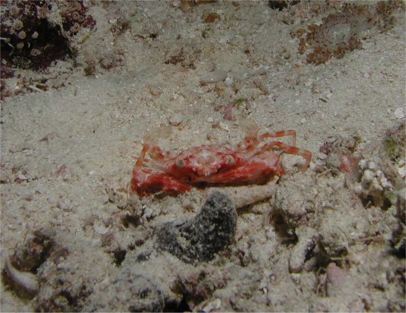 ナイトダイビングで撮りました。第4歩脚の指部がひれ状になっていることからワタリガニ科であることが分かりますが、手持ちの資料では該当する種類が見当たりませんでした。残念。