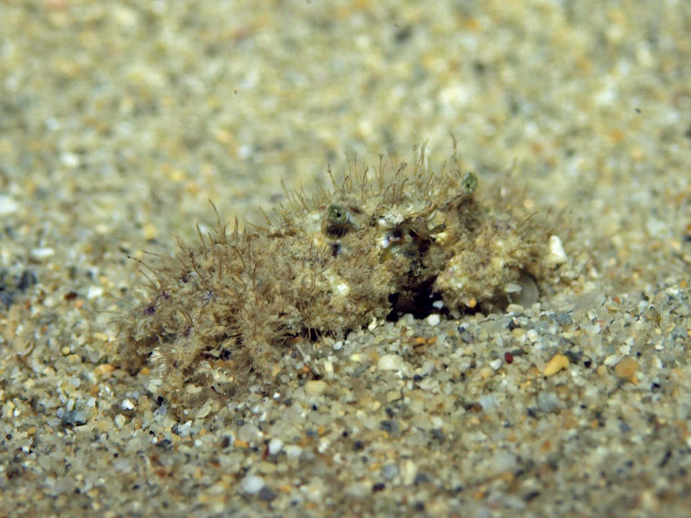 一見はケブカガニ科の仲間のように見えますが、毛のように見えるのはヒドロ虫かなにかでしょう。ケブカガニに化けても特に良いことがあるとは思えないけれど、これも擬装と言えるんでしょうか?
