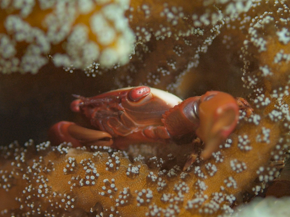 撮影 2014/02/09 インドネシア バリ島 掲載 2021/06/11 ⇒カニの仲間 サンゴの森の奥の方からこっちを凝視し、左ジャブを繰り出してきました。かなり不敵な面魂で強そうに見えますが、甲幅が2cmもないおちびちゃんなので睨まれても平気です。それに、黒目が眼鏡を外したときのノビ太みたいに小さいしね。