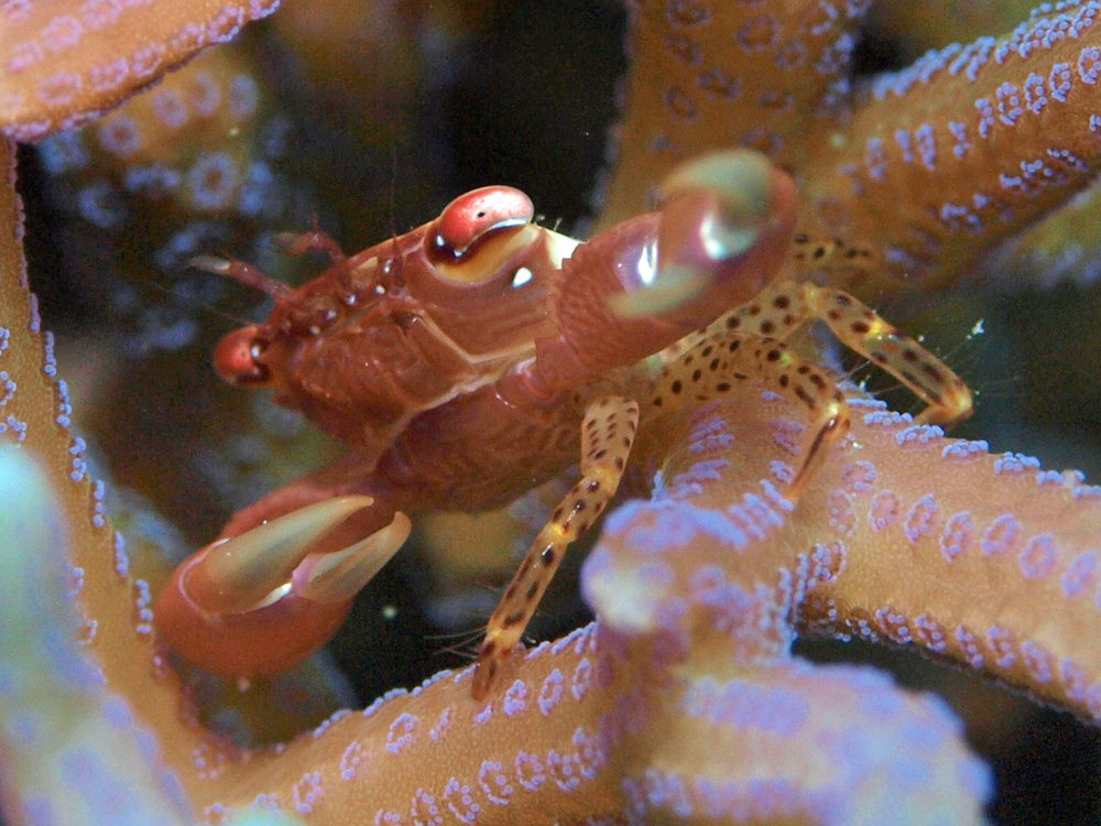 特徴である白い背中はチョットしか見えないけれど、他の特徴である赤っぽい体色やはさみ脚のシワシワ模様や歩脚のクリーム色の地色に褐色の斑点ははっきりと見て取れて、この個体がカノコサンゴガニであることを示しています。フーよかった。