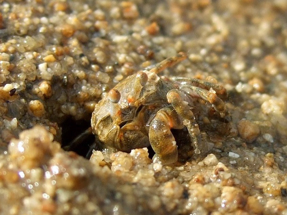 撮影 2008/05/12 沖縄県 石垣島 掲載 2012/10/16 ⇒カニの仲間 これは海中ではなく、干潮時の干潟で撮りました。河口付近の砂地に穴を掘って住んでいます。甲幅は1cmくらいか。 体色は生息環境に合わせて変化します。今回は前向きの写真を撮ったので追加掲載。