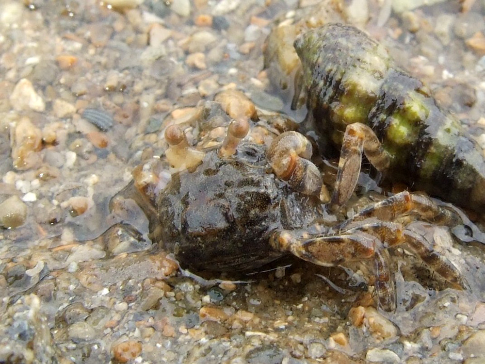 これは海中ではなく、干潮時の干潟で撮りました。河口付近の砂地に穴を掘って住んでいます。甲幅は1cmくらいか。