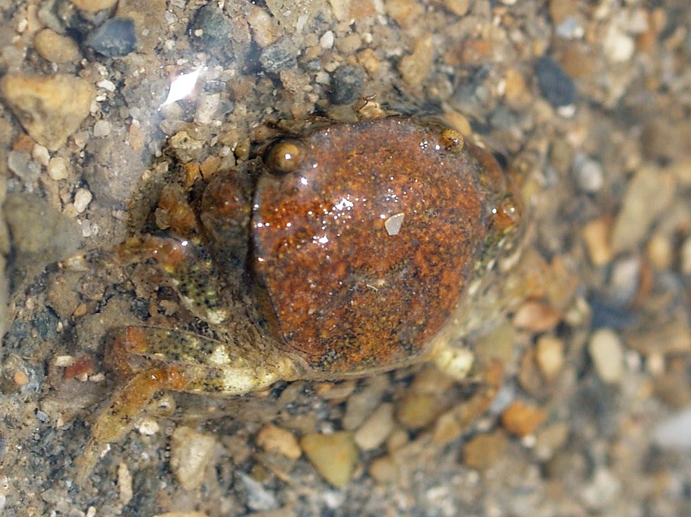 「甲の輪郭は丸みを帯びた四角形で、甲長と甲幅がほぼ同じくらいです。前側縁は切れ込みの浅い3歯よりなります。」まではそのとおりなのですが、「体色はうすい褐色です。」という点が、ボクの写真とは異なります。ごらんのとおり薄くなくて、しっかりした褐色です。