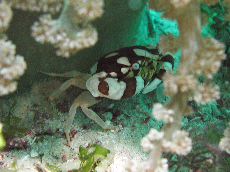 撮影 2003/03/11 フィリピン スミロン島 ⇒カニの仲間 安全停止を兼ねて水深5mmの岩場でぶらぶらしている時にひょいと出てきてくれたカニさん。これは甲幅4cmくらいの大きさで、自分で見つけることができました。色のメリハリがはっきりしていて良いですね。