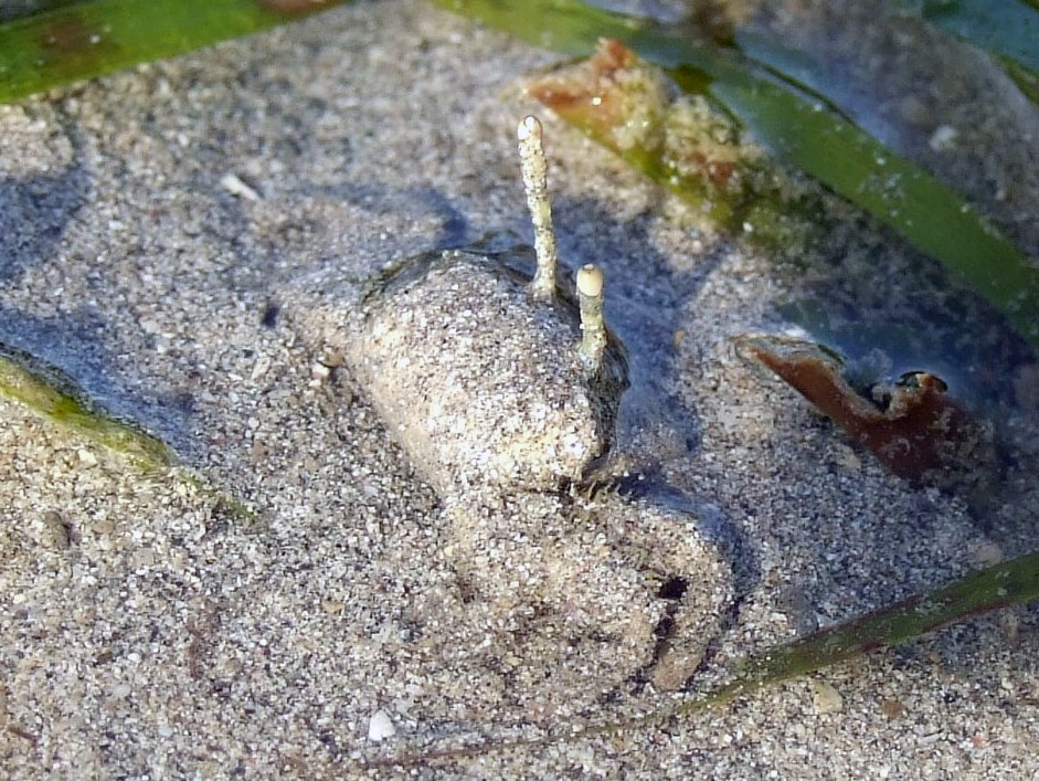 潮の引いた砂浜で撮影しました。甲羅も足も細かい砂がかぶってしまって模様が全然分かりませんが、ニョキッと伸びた眼柄でこのカニが何者であるかは一発で分かります。