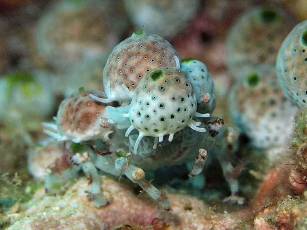 本人は大真面目に擬態しているのでしょうが、背負ったチャツボボヤの隙間から眼柄がはみ出ていて不格好で滑稽です。