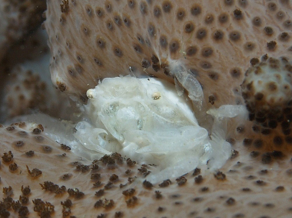 宿主はユビノウトサカだし、歩脚はすべてかぎ爪状だし、体形もトサカガザミそのものなんだけど、あるはずの暗褐色の18個の斑紋がなくて真白です・・・