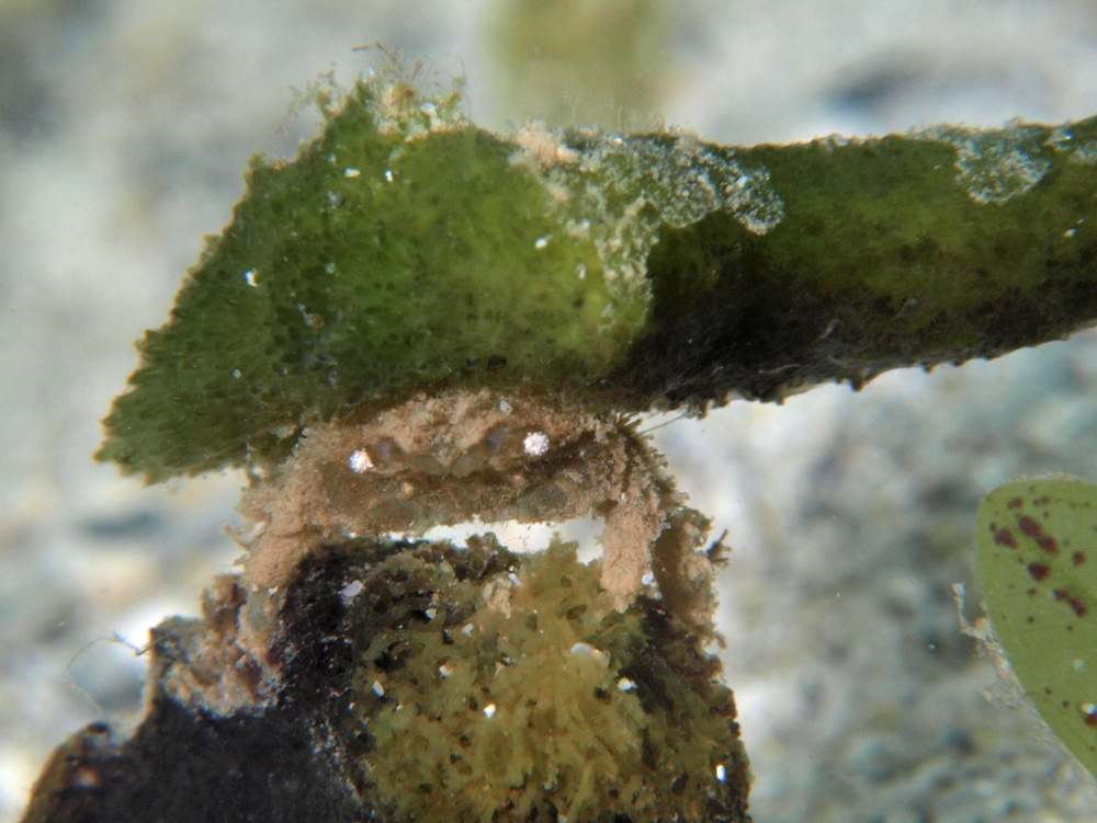 自分の体よりはるかに大きな海綿を背負ってカモフラージュしていたのに、あっさりとガイドに見つかってしまったちょっとだけアンラッキーなカニさん。