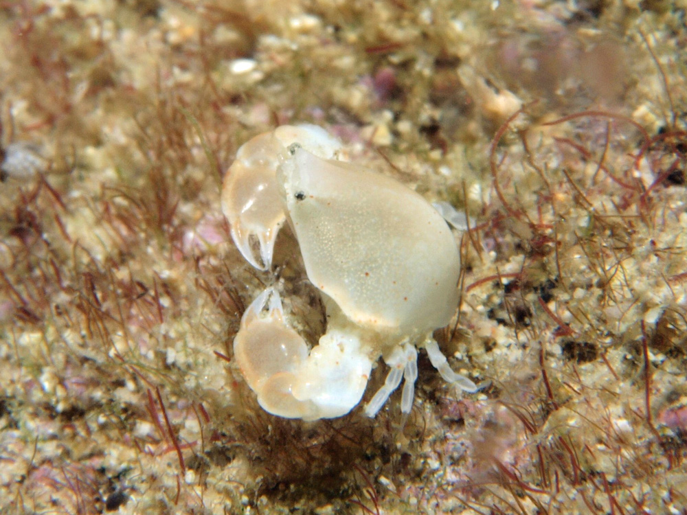 「もしかしたらオガサワラコブシガニのアルビノかもなあ?」などと根拠のないことを考えながら、“?”マークを付けることで自分の疑問に折り合いをつけることにしました。