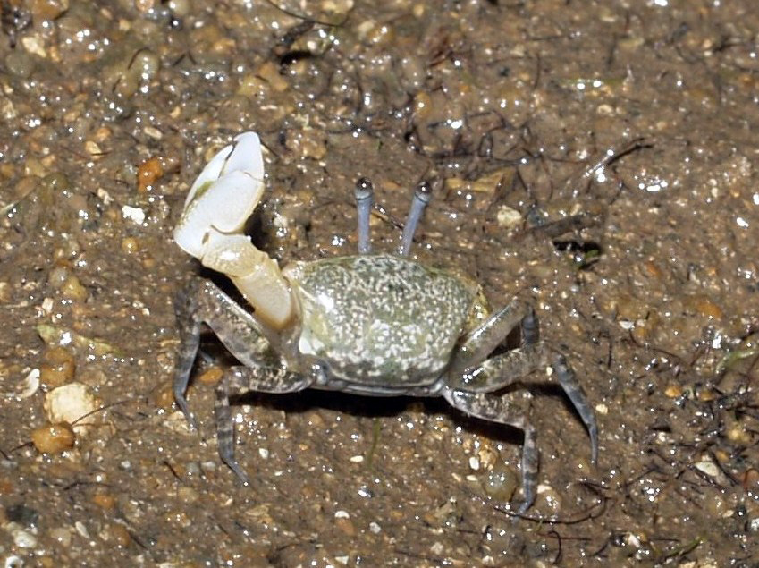 撮影 2008/05/12 沖縄県 石垣島 掲載 2012/10/20 ⇒カニの仲間 この種類は体色の変異がとても多いのですが、前掲とは異なる柄の個体をとったので追加しました。はさみ脚も前掲とは反対側が大きくなっています。