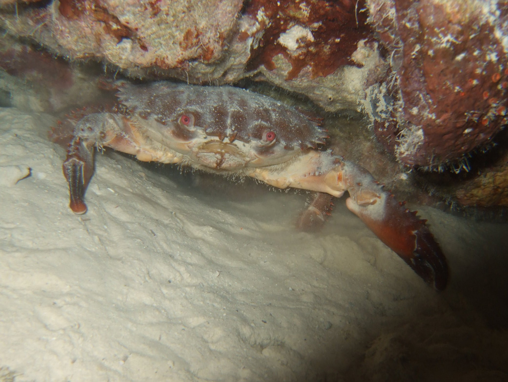 「海の甲殻類」 峯水亮/武田正倫/奥野淳児 (2002年文一総合出版)を参照しながら、体色からするとアカヒヅメガニに似ているけれどハサミ脚に小突起があるし、オオアカヒヅメガニにも似ているけれど体色が図鑑は真っ赤なのにこっちはほぼ茶色、という相違があってどちらとも決め切れませんでした。