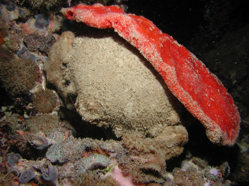 思いがけず大きなカニ(横幅20cmくらい)が水中ライトに照らされて浮き上がりました。背負っているのは真っ赤な海綿で、本来は自分をカムフラージュするためなのですが、光の中では目立つことこの上なし。