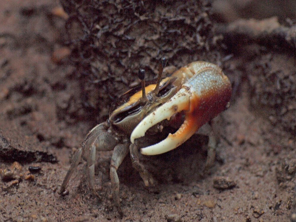 撮影 2014/08/12 沖縄県 石垣島 掲載 2024/12/15 ⇒カニの仲間 リュウキュウシオマネキの雄の近接写真が撮れたので追加しました。大きなハサミ足が目立ちますがそれはアピール用であって、日常生活での食料ゲットには砂粒をほじる小さなハサミ足が活躍します。