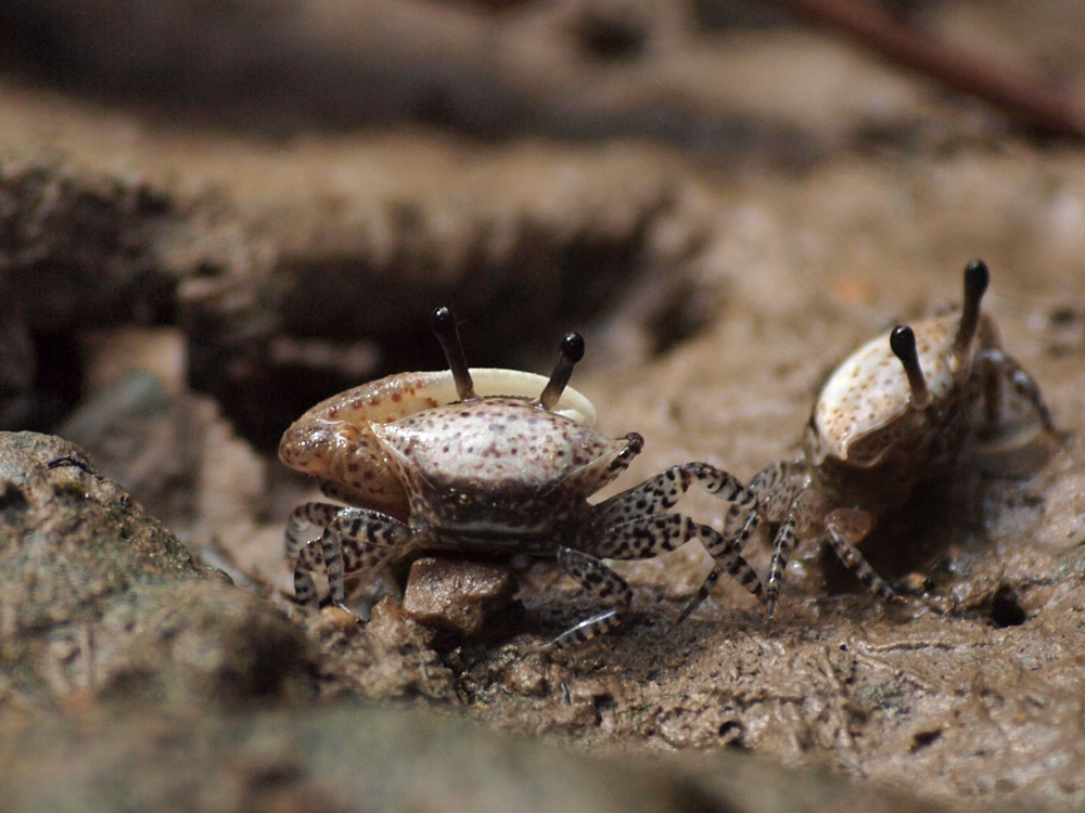 ガイドに教えてもらったこの個体はマングローブ林の中、6、7mほど先にいました。そんなに遠い距離ではなかったのですが、なにせ甲幅が1cmと小さい上に充分には光が差し込まないので撮影には一苦労しました。
