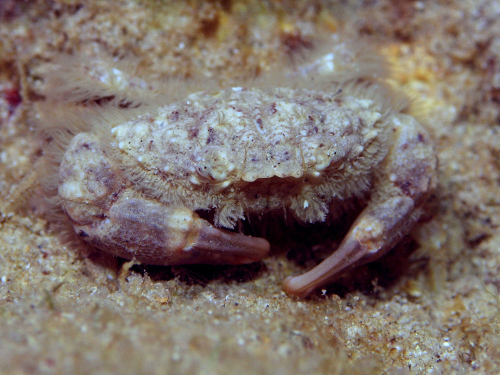このカニはずいぶん毛むくじゃらですが、この毛は何のためにあるんでしょうかね?目くらましの一種なんでしょうか。でも、そうだとしたらほとんどのカニが毛むくじゃらになるはずですが、むしろ多くのカニは無毛か少し生えている程度です。