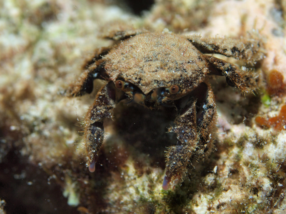 撮影 2013/08/02 沖縄県 沖縄島 掲載 2016/11/01 ⇒カニの仲間 以前掲載した写真と同様に甲殻類に詳しいガイドが名前を教えてくれたのですが、ボクには別種に見えるくらい見かけが違うので追加しました。(この個体の甲は目隠しを纏っているので本当の体色は見えません。)