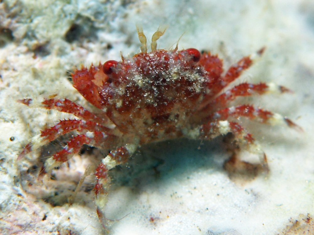 追記 2013/10/13 これまでは、『沖縄海中生物図鑑 7 甲殻類(カニ)』 海中公園センター (1988年初版新星図書出版)に従って学名をPhymodius granulosusとしてきましたが、Webサイト KANI-cyanはCyclodius granulosus としていることに気づいてWebサイト WoRMS(World Register of Marine Species)で確認したところ、Phymodiusという属名は認定されていませんでした。