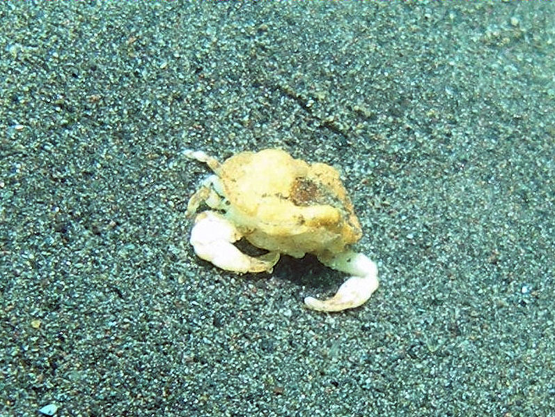 写りは悪いけれど、この被写体は内湾の砂利底で見つけ、乳白色の体にゴツゴツした甲羅や額が前方に突出し、はさみ脚はかま状であるなど、「海の甲殻類 ネイチャーガイド」にある解説とすべてが符合します。