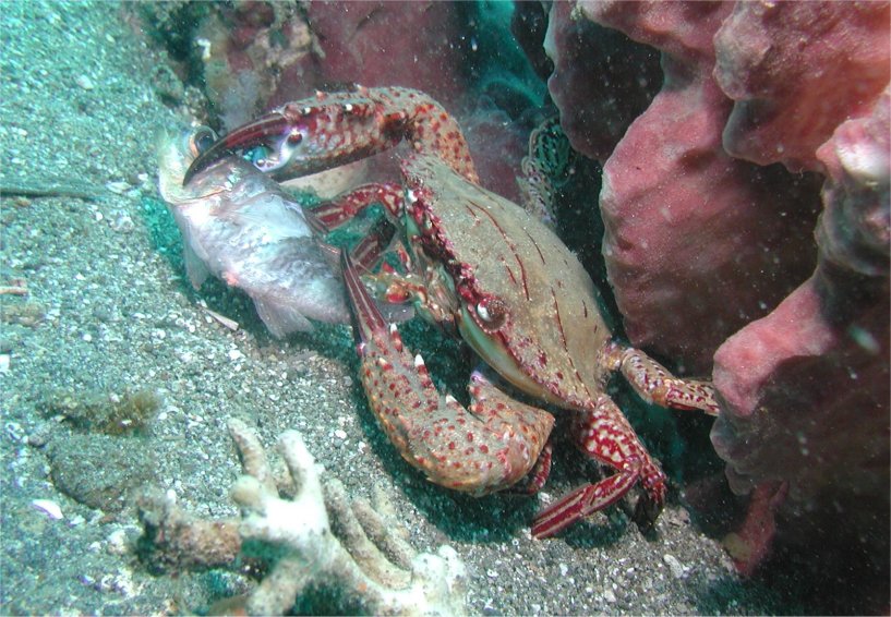 オイシそうな魚を捕獲した直後です。カニ自身の大きさは甲羅の幅で10cmほどあったでしょうか、両手の爪でしっかりつかんで、カメラがすぐそばで構えているのを横目に、尻尾の方からガツガツという感じで食べていました。