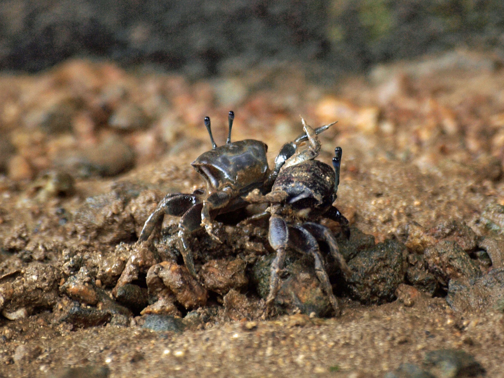 同じ種類の雄のカニどうしの喧嘩は雌の取り合いや縄張争いなどのシーンを度々見るのですが、同じカニではあっても違う種類の雌どうしが喧嘩しているシーンを目撃したのはこれが初めてです。決着が付くまでに、結構しつこくやり合って3〜4分かかりました。