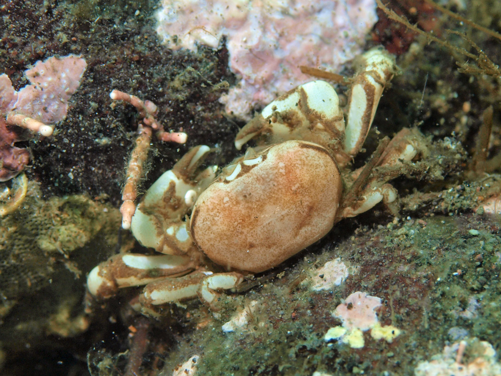 『海の甲殻類』 峯水亮/武田正倫/奥野淳児 (2002年初版2刷 文一総合出版)によると、北海道にのみ生息する甲幅1cm程の小さなカニです。