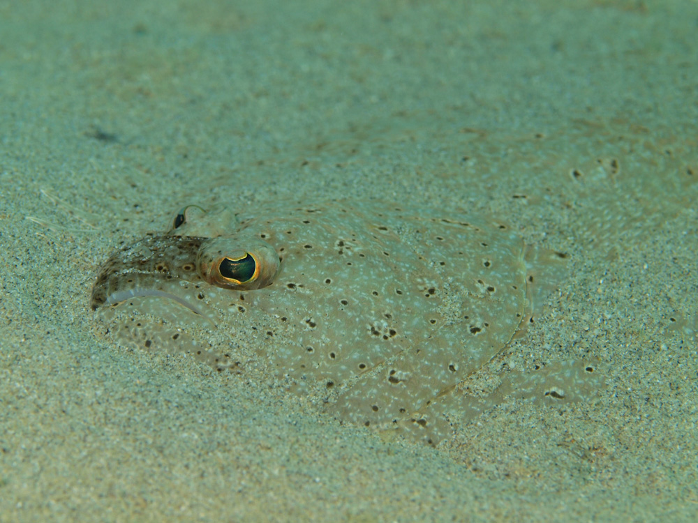 ガイドは「モンダルマガレイかも」と言っていましたが体側の斑紋が青いリングに囲まれていないので、そうではないでしょう。両眼は体の左側にあります。