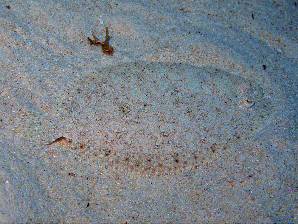 撮影 2008/06/13 沖縄県 黒島 掲載 2012/12/03 ⇒カレイ・ヒラメの仲間 青いリング状の斑紋が散在するのが特徴です。 この斑紋の色以外は周囲の環境に合わせて変えることができます。この写真の個体も砂地と全く同じ色になっています。完璧!
