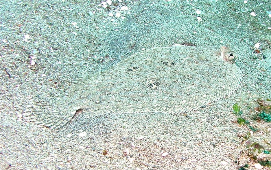 このあと、ストロボライトがまぶしかったのか、ふわっと浮き上がってヒラヒラと離れたところに移動して再びもぐってしまい、見失いました。モヨウは見事な砂地型でしたが、二つづつペアになっている黒い斑点はどういう意味があるのでしょうか? 目玉に見せているのかな?分かりません。