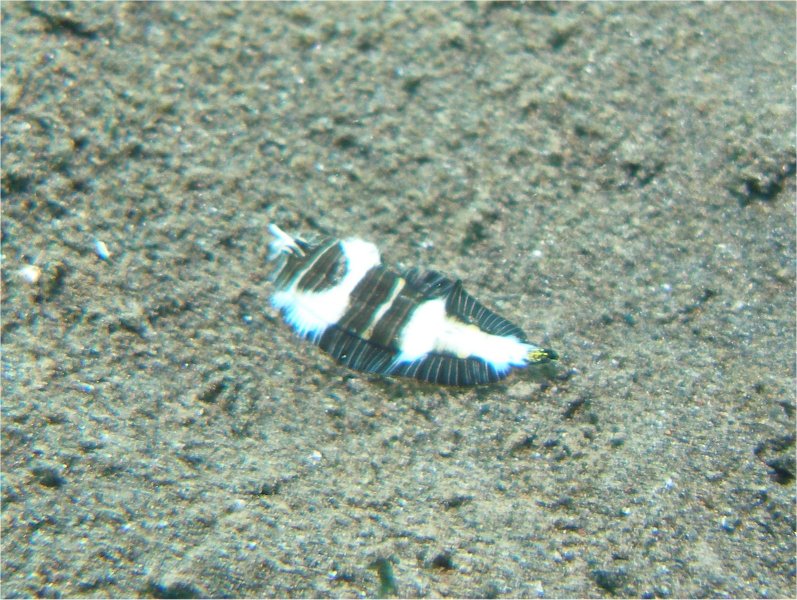 幼魚。 5cmはなかったと思います。地色は成魚と違って白ですが、ほぼ体全体に横縞があるところや尾鰭に黄色い小斑紋が沢山あるところなどが成魚と共通しています。