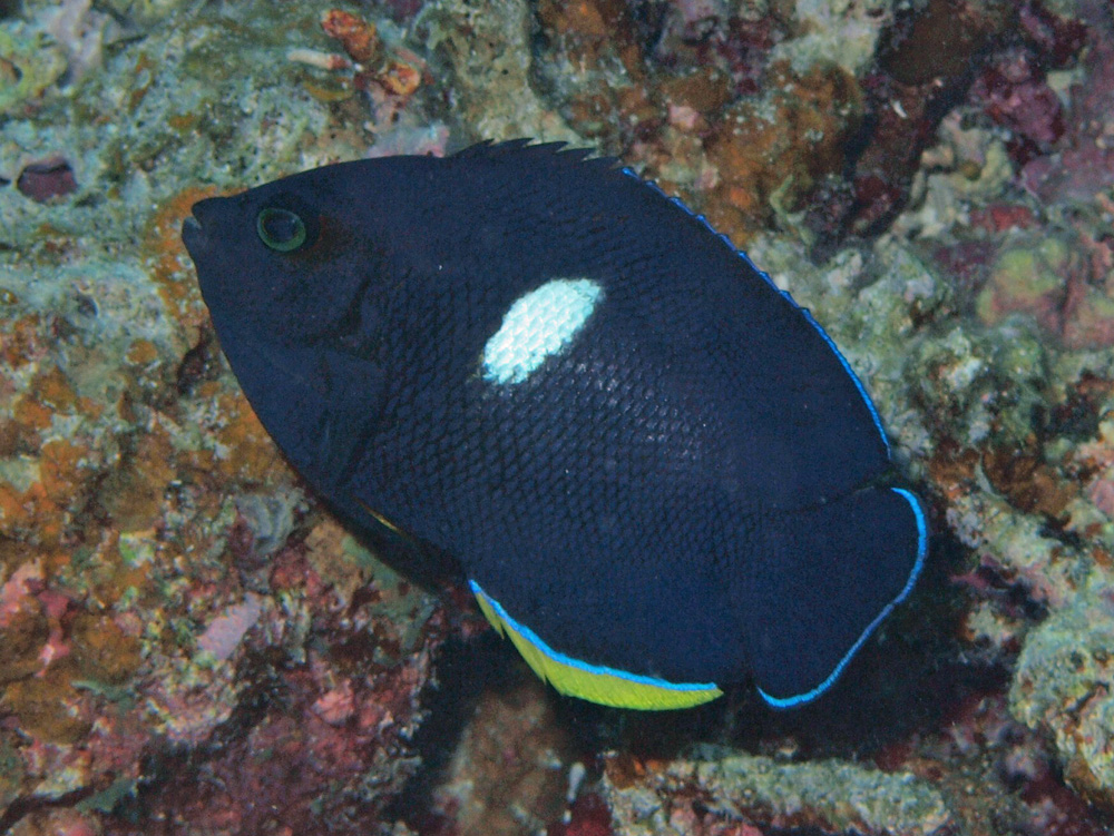 始め写そうとした時は黒字に白斑かと思っていました。その時はうまく写せず、後に見かけた時に濃紺であることに気づきました。写真ではうまく出せていませんが深みのあるいい色です。(眼の周りをホンソメワケベラがクリーニング中)