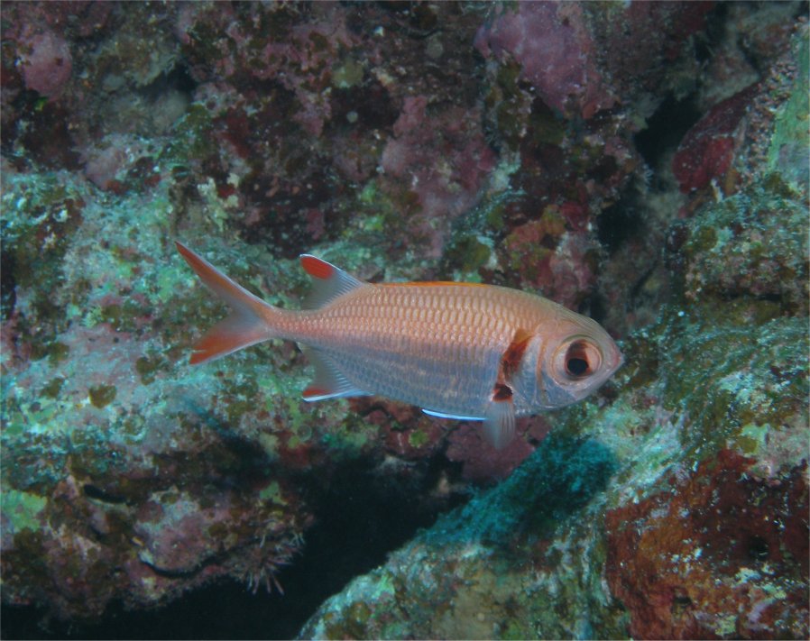 キンメダイの仲間は、ボクから見ると似たような特徴の種類ばかりで、同定に結構苦労します。クロオビマツカサとウロコマツカサもちょっと見は同じで、図鑑の解説でウロコマツカサは「鱗の後縁が黒ずんでいる印象を与えるのが特徴」とあって、”印象”で決めることになります。なんだかイイカゲンな”印象”を持ってしまいます。