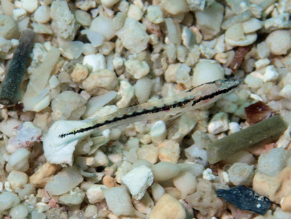 すごく小さくて、サンゴの砂粒の大きさと比べると稚魚と思われます。